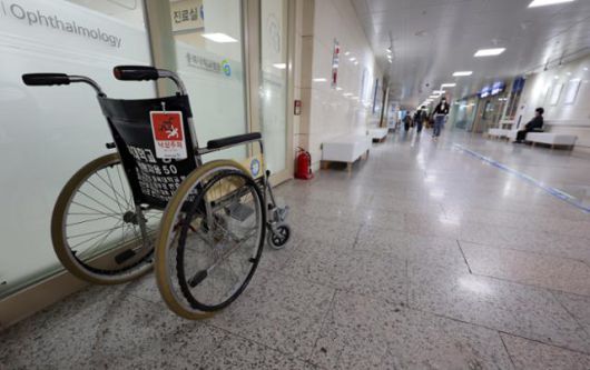 지난해 4월 5일 충북 청주시에 위치한 충북대병원의 복도 한쪽에 휠체어가 놓여 있다. 충북대병원은 충북 지역 유일한 상급종합병원이다. 연합뉴스 |