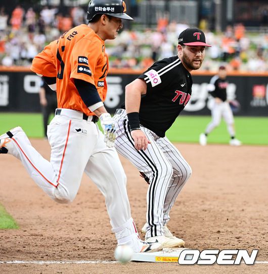 [OSEN=대전, 지형준 기자] 15일 대전 한화생명볼파크에서 2025 신한 SOL Bank KBO리그 한화 이글스와 LG 트윈스의 경기가 열렸다. 이날 한화는 문동주, LG는 송승기를 선발로 내세웠다. 4회말 2사 2루에서 LG 오스틴이 한화 최재훈의 내야안타에 신민재의 악송구를 놓치고 있다. 2025.06.15 /jpnews@osen.co.kr