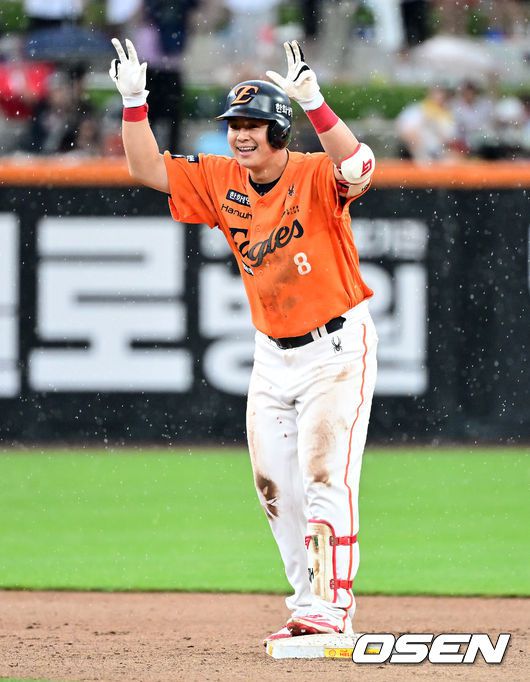 [OSEN=대전, 지형준 기자] 15일 대전 한화생명볼파크에서 2025 신한 SOL Bank KBO리그 한화 이글스와 LG 트윈스의 경기가 열렸다. 이날 한화는 문동주, LG는 송승기를 선발로 내세웠다. 5회말 1사 1루에서 한화 노시환이 역전 적시 2루타를 날리며 기뻐하고 있다. 2025.06.15 /jpnews@osen.co.kr