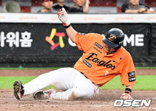 [OSEN=대전, 지형준 기자] 15일 대전 한화생명볼파크에서 2025 신한 SOL Bank KBO리그 한화 이글스와 LG 트윈스의 경기가 열렸다. 이날 한화는 문동주, LG는 송승기를 선발로 내세웠다. 5회말 1사 1루에서 한화 안치홍이 노시환의 역전 적시 2루타에 홈에서 슬라이딩 세이프되고 있다. 2025.06.15 /jpnews@osen.co.kr