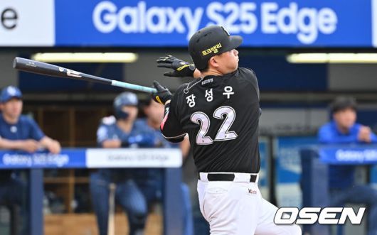 [OSEN=대구, 이석우 기자] 15일 대구삼성라이온즈파크에서 2025 신한 SOL 뱅크 KBO 리그 삼성 라이온즈와 KT 위즈의 경기가 열렸다. 홈팀 삼성은 최원태가, 방문팀 KT는 고영표가 선발 출전했다. KT 위즈 장성우가 6회초 2사 1,2루 중견수 왼쪽 2타점 2루타를 치고 있다. 2025.06.15 / foto0307@osen.co.kr