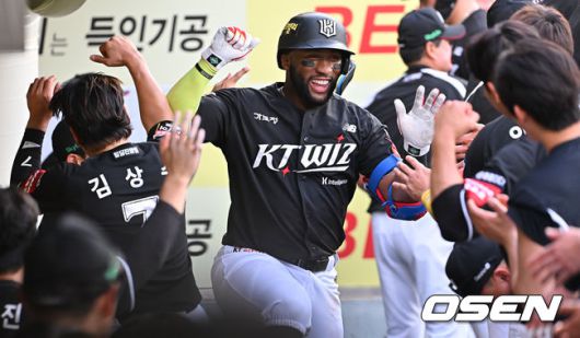 KT 위즈 로하스가 6회초 2사 2루 좌월 2점 홈런을 치고 하이파이브를 하고 있다. 2025.06.15 / foto0307@osen.co.kr