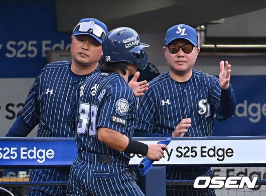 [OSEN=대구, 이석우 기자] 15일 대구삼성라이온즈파크에서 2025 신한 SOL 뱅크 KBO 리그 삼성 라이온즈와 KT 위즈의 경기가 열렸다. 홈팀 삼성은 최원태가, 방문팀 KT는 고영표가 선발 출전했다. 삼성 라이온즈 김성윤이 6회말 1사 3루 김도환의 좌익수 왼쪽 1타점 2루타때 득점을 올리고 박진만 감독의 축하를 받고 있다. 2025.06.15 / foto0307@osen.co.kr