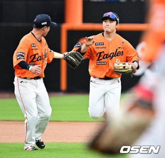 [OSEN=대전, 지형준 기자] 15일 대전 한화생명볼파크에서 2025 신한 SOL Bank KBO리그 한화 이글스와 LG 트윈스의 경기가 열렸다. 이날 한화는 문동주, LG는 송승기를 선발로 내세웠다. 5회초 2사 2루에서 한화 문현빈이 LG 이주헌의 좌전안타에 홈에서 LG 문성주를 아웃시키며 동료선수들과 기뻐하고 있다. 2025.06.15 /jpnews@osen.co.kr