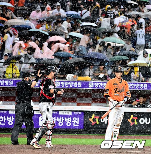 [OSEN=대전, 지형준 기자] 15일 대전 한화생명볼파크에서 2025 신한 SOL Bank KBO리그 한화 이글스와 LG 트윈스의 경기가 열렸다. 이날 한화는 문동주, LG는 송승기를 선발로 내세웠다. 5회말 1사 2루에서 한화 채은성 타석에 폭우로 경기가 중단되고 있다. 2025.06.15 /jpnews@osen.co.kr