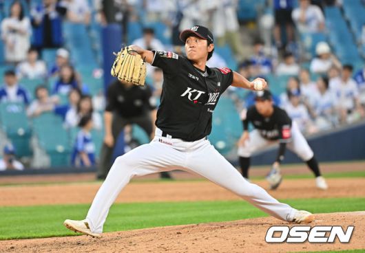 [OSEN=대구, 이석우 기자] 15일 대구삼성라이온즈파크에서 2025 신한 SOL 뱅크 KBO 리그 삼성 라이온즈와 KT 위즈의 경기가 열렸다. 홈팀 삼성은 최원태가, 방문팀 KT는 고영표가 선발 출전했다. KT 위즈 전용주가 역투하고 있다. 2025.06.15 / foto0307@osen.co.kr