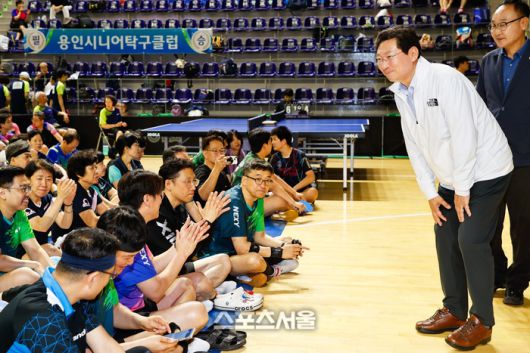 14일 이상일 시장이 ‘제2회 용인시장배 탁구대회’에 참석해 출전 선수들과 인사를 나누고 있다. 제공=용인시 |