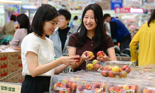 15일 서울 서초구 하나로마트 양재점에서 고객들이 천도복숭아를 살펴보고 있다. 하나로마트 양재점 등 농협유통 매장에서는 제휴카드로 결제한 고객에게 천도복숭아를 할인 판매한다. 천도복숭아의 풍부한 구연산과 사과산은 만성 피로 해소에 도움을 준다고 알려져 있다. 농협유통 제공 ⓒ 세상을 보는 눈, 세계일보
