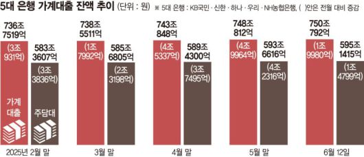 15일 금융권에 따르면 5대 은행(KB국민·신한·하나·우리·NH농협은행)의 가계대출 잔액(12일 기준)은 750조792억원으로 집계됐다. 지난달 말(748조812억원)과 비교해 1조9980억원이 늘었다.