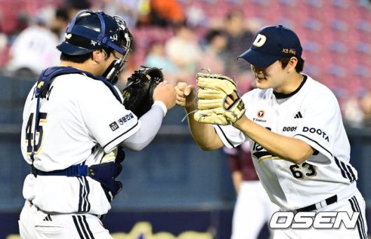 [OSEN=잠실, 조은정 기자]프로야구 두산 베어스가 ‘토종 에이스’ 곽빈의 시즌 첫 승 호투에 힘입어 2연승을 거뒀다. 두산은 15일 서울 잠실구장에서 열리는 2025 신한 SOL Bank KBO리그 키움 히어로즈와의 홈경기를 3-2로 이겼다. 두산 김기연, 김택연 배터리가 승리를 기뻐하고 있다. 2025.06.15 /cej@osen.co.kr