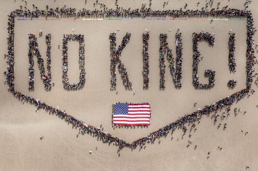 14일(현지 시간) 미국 샌프란시스코 오션비치에서 시민들이 모래사장 위에서 ‘노 킹(No King·왕은 없다)’ 문구를 나타내며, 도널드 트럼프 행정부 반대 시위를 벌이고 있다. 트럼프 대통령의 79번째 생일이기도 한 이날, 미국 2000여 곳에서 시위가 열린 것으로 추산된다. (샌프란시스코=AP 뉴시스) |