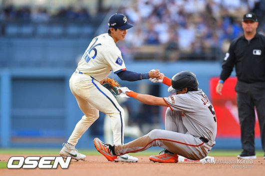 [사진] LA 다저스 김혜성(왼쪽)이 1회초 엘리엇 라모스의 병살타 때 2루에서 포스 아웃되며 넘어진 이정후를 일으켜 세우고 있다. ⓒGettyimages(무단전재 및 재배포 금지) |