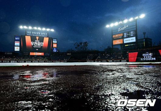 [OSEN=대전, 지형준 기자] 15일 대전 한화생명볼파크에서 2025 신한 SOL Bank KBO리그 한화 이글스와 LG 트윈스의 경기가 열렸다. 이날 한화는 문동주, LG는 송승기를 선발로 내세웠다. 5회말 한화가 노시환의 적시타로 역전에 성공하자마자 폭우로 인해 우천 중단되고 있다. 2025.06.15 /jpnews@osen.co.kr