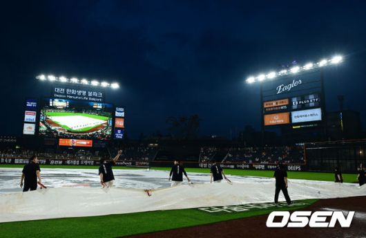 [OSEN=대전, 지형준 기자] 15일 대전 한화생명볼파크에서 2025 신한 SOL Bank KBO리그 한화 이글스와 LG 트윈스의 경기가 열렸다. 이날 한화는 문동주, LG는 송승기를 선발로 내세웠다. 5회말 경기가 중단된 가운데 비가 잦아들며 방수포를 걷고 경기 재개를 준비하고 있다. 2025.06.15 /jpnews@osen.co.kr