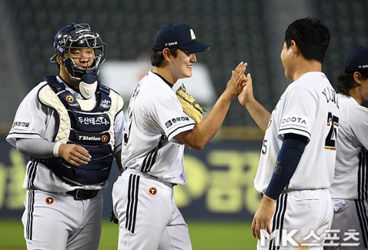 두산 김택연, 양의지가 승리 하이파이브를 하고 있다.