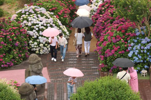 제주도에 이른 장마가 시작된 12일 오전 제주 서귀포시 안덕면 덕수리 카페 마노르블랑을 찾은 관광객이 우산을 쓰고 수국이 만개한 정원을 산책하고 있다. |
