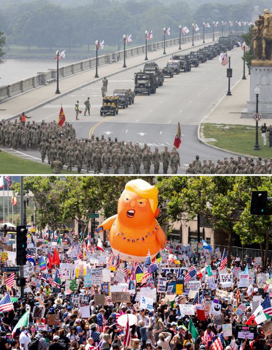 열병식에 앞서 미 전역에서는 트럼프 대통령에 반대하는 ‘노 킹스’ 시위가 벌어졌다. 뉴욕, 로스앤젤레스(LA), 필라델피아, 시카고, 휴스턴 등 주요 대도시는 물론 공화당 강세 지역까지 약 2000곳에서 열린 집회에는 트럼프 2기 행정부 출범 이후 최대 규모 인파가 운집했다. 주최 측은 트럼프 대통령에게 빌미를 주지 않는다는 의미에서 워싱턴은 공식 집회 장소에서 제외했지만 백악관 주변 라파예트 광장, 워싱턴 북쪽 로건 광장 등에서 수백명이 시위를 벌였다.