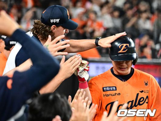 [OSEN=대전, 지형준 기자] 15일 대전 한화생명볼파크에서 2025 신한 SOL Bank KBO리그 한화 이글스와 LG 트윈스의 경기가 열렸다. 이날 한화는 문동주, LG는 송승기를 선발로 내세웠다. 5회말 1사 2루에서 한화 노시환이 채은성의 1타점 중전 적시타에 득점에 성공하며 동료선수들과 기뻐하고 있다. 2025.06.15 /jpnews@osen.co.kr