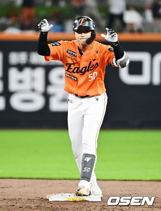[OSEN=대전, 지형준 기자] 15일 대전 한화생명볼파크에서 2025 신한 SOL Bank KBO리그 한화 이글스와 LG 트윈스의 경기가 열렸다. 이날 한화는 문동주, LG는 송승기를 선발로 내세웠다. 5회말 2사 1,3루에서 한화 이원석이 1타점 적시타를 날리며 기뻐하고 있다. 2025.06.15 /jpnews@osen.co.kr