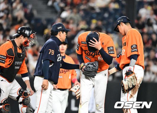 [OSEN=대전, 지형준 기자] 15일 대전 한화생명볼파크에서 2025 신한 SOL Bank KBO리그 한화 이글스와 LG 트윈스의 경기가 열렸다. 이날 한화는 문동주, LG는 송승기를 선발로 내세웠다. 6회초 2사 2,3루에서 한화 조동욱이 교체되고 있다. 2025.06.15 /jpnews@osen.co.kr