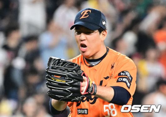 [OSEN=대전, 지형준 기자] 15일 대전 한화생명볼파크에서 2025 신한 SOL Bank KBO리그 한화 이글스와 LG 트윈스의 경기가 열렸다. 이날 한화는 문동주, LG는 송승기를 선발로 내세웠다. 6회초 2사 2,3루에서 한화 박상원이 LG 오스틴을 중견수 플라이로 처리하며 기뻐하고 있다. 2025.06.15 /jpnews@osen.co.kr