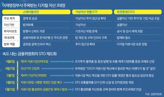 원화기반 스테이블코인과 가상자산 현물 상장지수펀드(ETF), 토큰증권(STO) 등 국내 디지털 자산 시장이 이재명정부의 출범과 함께 들썩이고 있다. 특히 가상자산 투자자들을 비롯해 사업자들은 이재명정부에서 진행 중인 디지털 자산 관련 법제화에 촉각을 곤두세우고 있다. 법제화와 지원책 선후에 따라 관련 업계의 희비가 엇갈리기 때문이다. 하지만 이들 디지털 자산은 각자 다른 역할과 목적, 제도적 특성을 보이는 만큼 법제화 속도에도 차이를 보일 것으로 전망된다. 특히 STO의 경우 국회와 금융당국의 이견이 없어 최근 최우선 법제화 대상으로 급부상하고 있다.