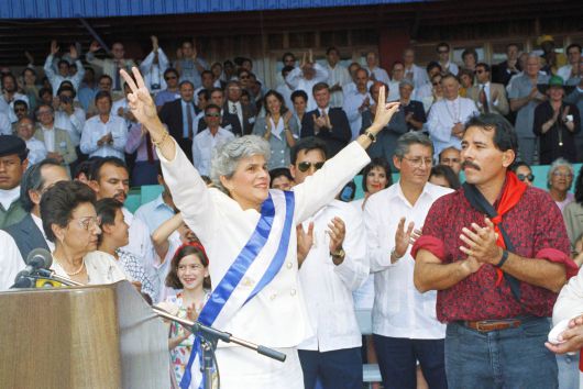 그러나 정권을 잡은 오르테가와 FSLN은 강경 반미 노선과 경제난으로 민심을 잃었고 저항하는 국민을 공권력으로 탄압했다. 좌파 독재에 맞선 민주화 운동의 선봉에 선 차모로는 11년째 집권해오던 오르테가를 1990년 대선에서 꺾었다. 이후 7년간 집권하면서 정치적 다양성, 오랜 내전으로 분열한 사회 통합에 노력했다는 평가를 받는다. 워싱턴포스트는 “차모로는 지지자들에게 어머니로 불리며 평화와 이해를 설파했던 니카라과의 성인(聖人)과도 같은 존재였다”고 평했다.
