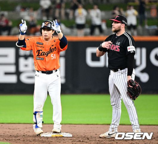 [OSEN=대전, 지형준 기자] 15일 대전 한화생명볼파크에서 2025 신한 SOL Bank KBO리그 한화 이글스와 LG 트윈스의 경기가 열렸다. 이날 한화는 문동주, LG는 송승기를 선발로 내세웠다. 6회말 무사에서 한화 문현빈이 2루타를 날리며 기뻐하고 있다. 2025.06.15 /jpnews@osen.co.kr