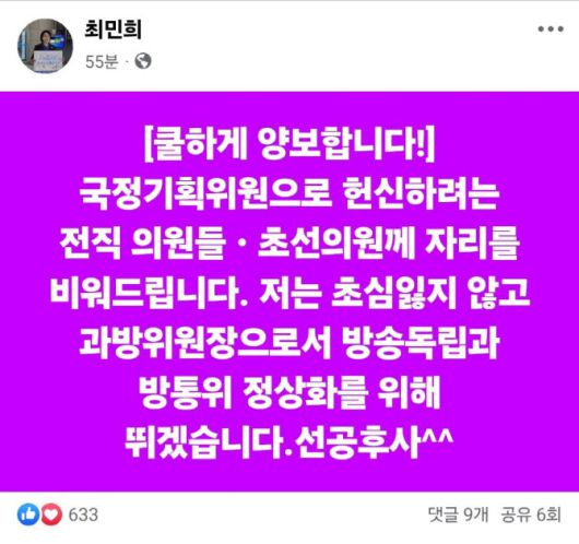 최 의원은 15일 페이스북을 통해 “국정기획위원으로 헌신하려는 전직 의원들·초선 의원께 자리를 비워드린다”며 “저는 초심을 잃지 않고 과방위원장으로서 방송독립과 방통위 정상화를 위해 뛰겠다. 선공후사”라고 밝혔다.