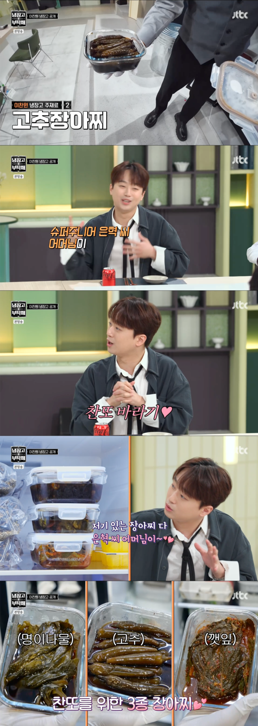냉장고에는 슈퍼주니어 은혁의 어머니가 준 고추 장아찌가 나오기도. 이찬원은 “은혁 씨 어머님이 저를 예뻐해주셔서. 저기 있는 장아찌 다 은혁 씨 어머님이 해주신 거다”라고 밝혔다.