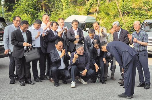 정청래, 李대통령 어릴 적 친구들에게 90도 인사 - 더불어민주당 정청래 의원이 14일 서울 모처에서 열린 이재명 대통령의 장남 이동호씨 결혼식에 참석했다가 하객으로 참석한 이 대통령의 소년공 시절 공장 동료들에게 허리 숙여 인사하고 있다. /정청래 의원 페이스북 |