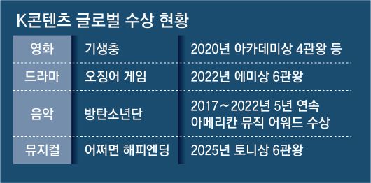 글로벌 시상식에서도 K콘텐츠의 존재감은 두드러졌다. 영화 ‘기생충’은 2020년 아카데미 시상식에서 작품상을 포함해 4관왕에 올랐고, 드라마 ‘오징어 게임’은 2022년 에미상에서 6관왕을 기록했다. 두 작품 모두 해당 시상식에서 비영어권 작품으로는 처음으로 주요 부문을 수상한 사례였다. K팝 아티스트 방탄소년단도 2017년부터 2022년까지 5년 연속 아메리칸 뮤직 어워드 수상자로 이름을 올렸다. K뮤지컬 ‘어쩌면 해피엔딩’은 8일 미국 공연계 최고 권위를 자랑하는 토니상에서 작품상을 비롯해 6관왕에 오르는 기염을 토하기도 했다. ‘공연계의 아카데미상’으로 불리는 토니상에서 국내 초연의 토종 뮤지컬이 상을 받은 건 처음이다.