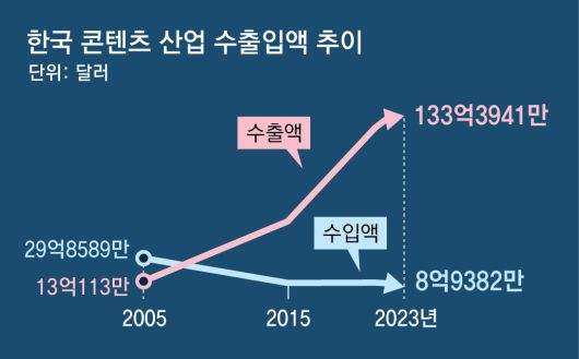 K콘텐츠의 위상 변화는 각종 실적에서 뚜렷이 나타난다. 문화체육관광부에 따르면 한국의 콘텐츠 산업 수출액은 한류 초기인 2005년 13억113만 달러에서 2015년 56억6137만 달러, 2023년 133억3941만 달러로 급증했다. 반면 수입액은 같은 기간 29억8589만 달러에서 11억8282만 달러, 8억9382만 달러로 감소했다.