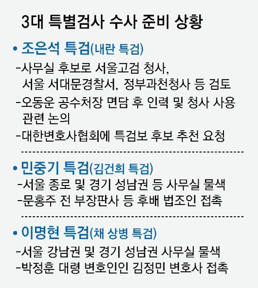 내란, 김건희, 채 상병 사건을 수사할 조은석, 민중기, 이명현 특별검사(특검)가 동시 출범한 가운데 각 특검이 수사 공간 마련과 수사팀 구성 준비에 들어갔다. 휴일에도 관련 절차에 속도를 내면서, 이르면 다음 주중 특검 사무실과 특별검사보(특검보) 등 수사팀 지휘부 후보군이 윤곽을 드러낼 것으로 전망된다.