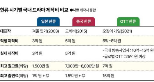 그렇다면 정부가 제작비를 충분히 지원하면 문제가 해결될 수 있을까. 그렇지 않다. 제작비 상승은 글로벌 OTT 때문에 발생한 게 아니라 이전부터 반복적으로 심화한 고질적 문제다. 2003년 3억 원이던 회당 제작비가 2015년 5억 원대까지 상승했다. 그래도 이 시기에는 국내 제작 드라마가 일본, 중국에서 성공하는 방식이었기 때문에 방송사가 제작비를 감당할 수 있었다.