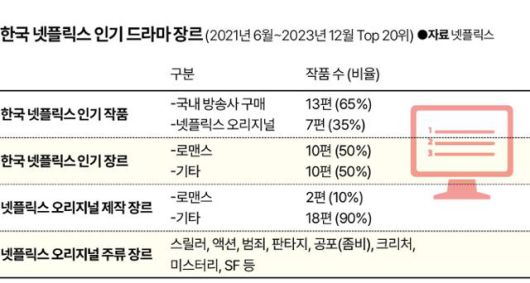 2021년~2023년까지 한국 넷플릭스 드라마 인기 순위 20위 중에서 로맨스 장르만 10편(50%)에 달한다. 반면 한국 넷플릭스에서 오리지널로 제작한 로맨스 장르는 단 두 편(10%)에 불과하다. 내수시장과 세계시장 소비자 취향의 극명한 차이를 보여준다. 과감한 투자로 자체 OTT를 갖췄더라도, 콘텐츠의 다양성이 글로벌 스탠다드에서 벗어나면 지속 가능성은 떨어질 수밖에 없다.
