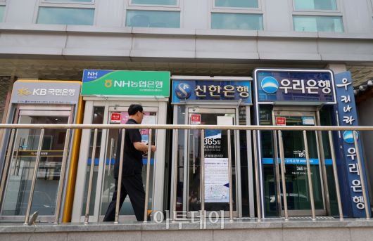 한국은행의 기준금리 동결이 이어지자 시장금리가 정점을 찍고 하락하고 있다. 5일 은행연합회 소비자포털 공시자료에 따르면 5월 기준(4월 취급분) 5대 은행(KB국민·신한·하나·우리·NH농협)의 주택담보대출(분할상환방식) 평균금리는 연 4%대에 머물렀다. 사진은 이날 서울 시내에 설치된 시중은행 현금인출기. 고이란 기자 photoeran@ |