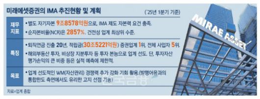 미래에셋 역시 IMA 진출 시 새로운 기회가 될 것으로 본다. 미래에셋증권은 최근 2025년 1분기 실적 컨퍼런스콜에서 "IMA는 기존에 없던 유형의 금융투자 상품으로, WM 경쟁력 강화에 큰 도움이 될 것으로 본다"며 하반기에 신청하겠다고 밝혔다.