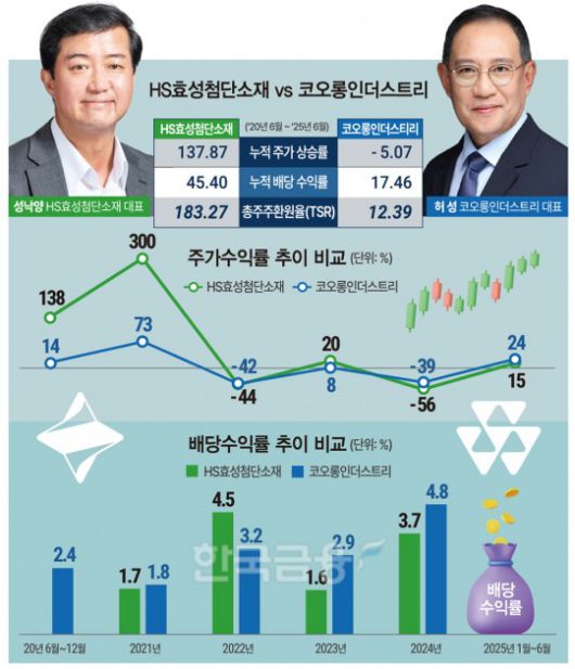 두 기업 수익률 차이는 주가상승률이 갈랐다. 지난 5년 사이 HS효성첨단소재는 8만6900원에서 20만1500원으로 137.9% 올랐지만, 코오롱인더스트리는 3만5500원에서 시작해 현재 3만3700원으로 5% 떨어졌다. 2~4%대인 연 배당률은 코오롱인더스트리가 조금 더 낫지만, 배당수익률은 주가 상승이 이뤄진 HS효성첨단소재가 압도했다.