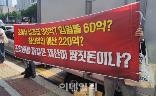 평촌 어바인스트 조합원들이 조합장과 임원들 성과급 지급을 반대하는 현수막을 들고 시위하고 있다.(사진=제보자) |
