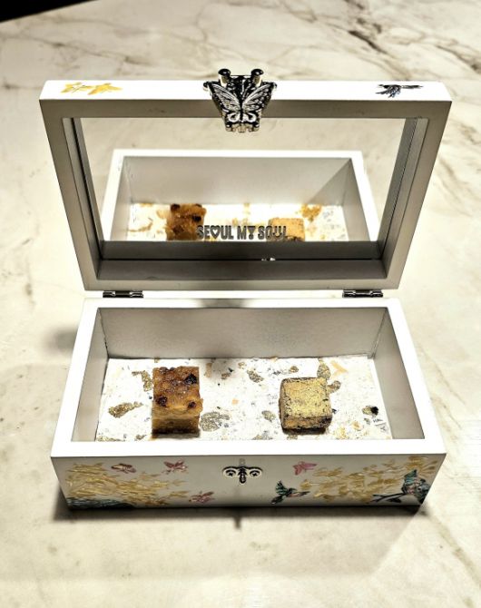 서울시 홍보대사이자 유명 셰프인 에드워드 리가 시 굿즈인 ‘서울마이소울 자개함’을 활용해 만든 디저트 ‘한입’의 모습. 구운 잣 파이와 된장 캐러멜 인절미로 구성됐다. 서울시 제공 |