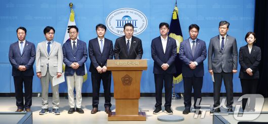 김병기 더불어민주당 신임 원내대표가 15일 오전 서울 여의도 국회 소통관에서 원내대표단 인선발표를 하고 있다. 왼쪽부터 문금주·김현정 대변인, 허영 정책수석, 문진석 운영수석, 김 원내대표, 박상혁 소통수석, 이기헌 비서실장, 김남근 민생부대표, 백승아 대변인. 2025.6.15/뉴스1 ⓒ News1 김민지 기자 |