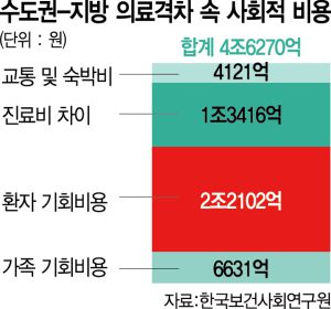 한국보건사회연구원이 15일 공개한 ‘지역 환자 유출로 인한 비용과 지역 국립대학병원에 대한 국민 인식’ 보고서에 따르면 지방 거주 환자가 지역 국립대병원 대신 서울 상급종합병원을 이용함에 따라 추가로 드는 비용은 연간 최대 4조6270억 원으로 추산된다. 숙박비와 교통비만 합해도 4121억원에 이르며, 여기에 병원 간 진료비 차이를 고려한 비용도 1조7537억원이나 됐다. 여기에 진료에 따른 환자 본인 및 가족들의 기회비용을 추산한 결과 이 같은 수치가 나왔다.
