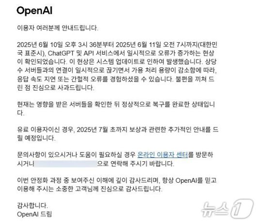오픈AI 서비스 장애 사과·보상 안내 메일 갈무리 |