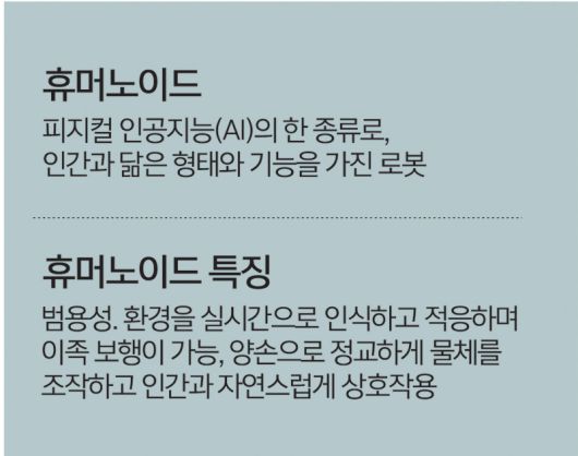 휴머노이드는 피지컬 인공지능(AI)의 한 종류로, 인간과 닮은 형태·기능을 가진 로봇이다. 복잡하고 수시로 변하는 현실에 인간처럼 잘 적응해서 반응하고 양손으로 물체를 정교하게 조작하는 능력을 갖췄으며 다양한 일에 쓰일 수 있는 범용성이 특징이다.