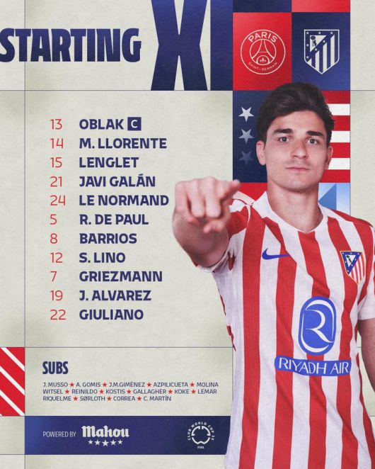 이에 맞선 ATM은 앙투안 그리즈만, 훌리안 알바레즈, 사무엘 리누, 파블로 바리오스, 호드리고 데 파울, 줄리아노 시메오네, 하비 갈란, 클레망 랑글레, 로뱅 르 노르망, 마르코스 요렌테, 골키퍼 얀 오블락이 선발 출격했다.
