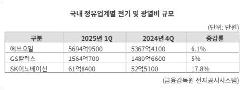 16일 업계에 따르면, 에쓰오일의 올해 1·4분기 전기 및 광열비는 5694억9500만원으로 전 분기(2024년 4·4분기) 대비 6.1% 증가했다. 같은 기간 GS칼텍스와 SK이노베이션도 광열비가 각각 5%, 17.8% 늘었으며 정유 3사의 평균 증가율은 9.6%에 달했다.
