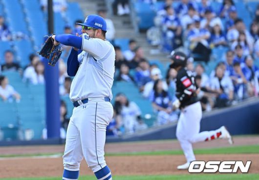 [OSEN=대구, 이석우 기자] 15일 대구삼성라이온즈파크에서 2025 신한 SOL 뱅크 KBO 리그 삼성 라이온즈와 KT 위즈의 경기가 열렸다. 홈팀 삼성은 최원태가, 방문팀 KT는 고영표가 선발 출전했다. 삼성 라이온즈 최원태가 3회초 1사 KT 위즈 장성우에게 우월 솔로 홈런을 맞고 아쉬워하고 있다. 2025.06.15 / foto0307@osen.co.kr |