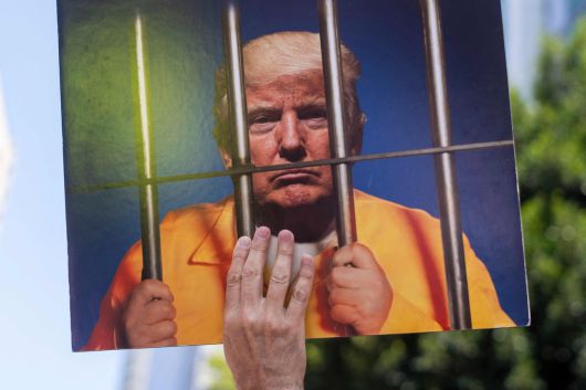 지난 14일(현지시간) 미국 캘리포니아주 로스앤젤레스 시내에서 열린 ‘노 킹스’ 전국 집회에서 시위대가 트럼프 행정부에 반대하는 시위를 벌이는 동안 감옥 뒤에서 도널드 트럼프 대통령의 사진을 들고 있다. [AFP] |