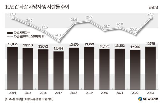 통계청의 10년간 자살 사망자 추이에 따르면 2023년 자살사망자 수는 1만3978명이다. 이재명 대통령이 첫 국무회의에서 한국의 높은 자살률을 언급할 만큼 한국 국민은 지친 나머지 스스로를 포기하게 된다.